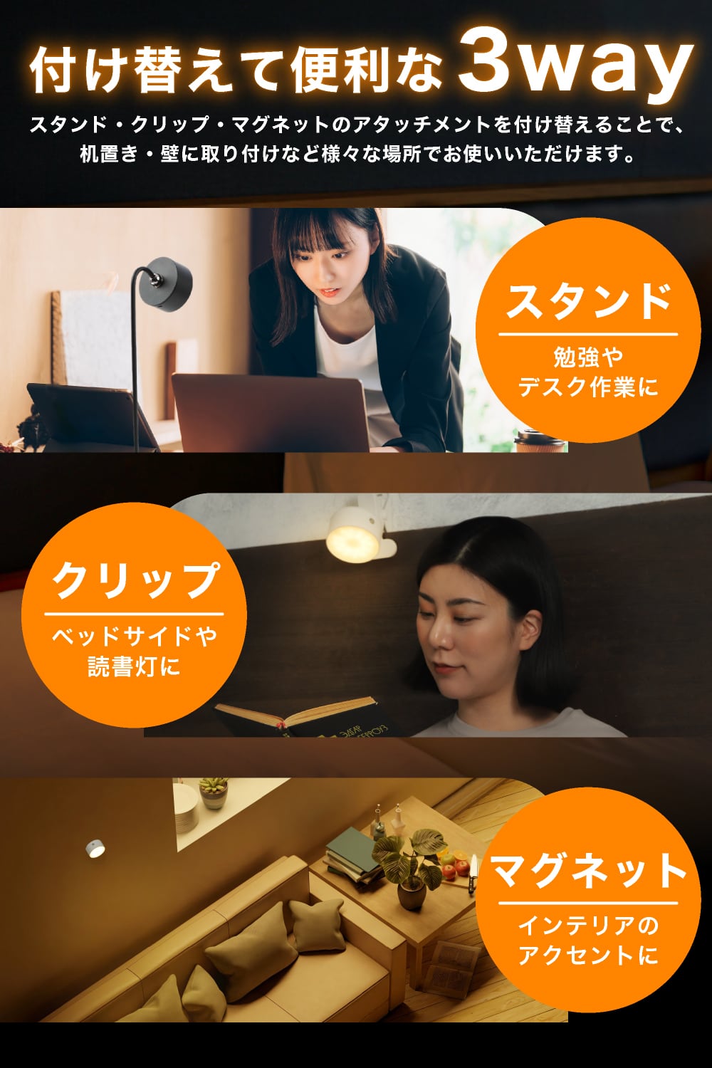 シンプル/おしゃれ・便利をテーマにデザインされた3WAYテーブルランプは、インテリアに馴染みやすく、夜に間接照明として目に優しく、暖かくロマンチックな雰囲気を醸し出します。シンプルかつおしゃれで便利な弊社の3WAYのライトは生活のあらゆるシーンで大活躍します。
